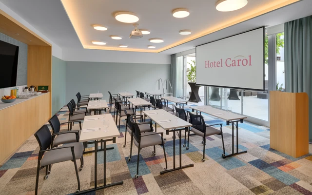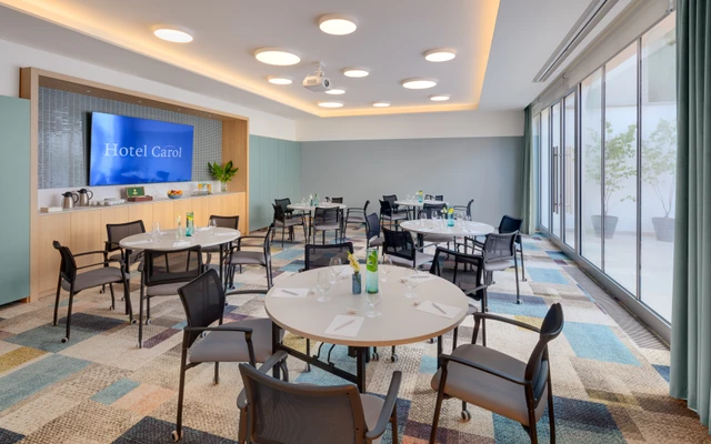 Ein klimatisierter Saal mit Tageslicht und direktem Zugang zur Sommerterrasse, ausgestattet mit moderner Präsentationstechnik